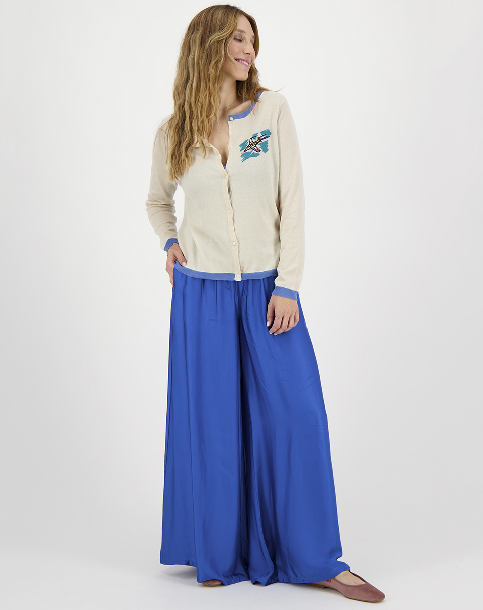 Wide leg pants in fuchsia with two side pockets and two back pockets. Waistband is elasticized with five belt loops and has a contrasting sash drawstring. Pair with our crop top or tank or tee for a playful casual look.