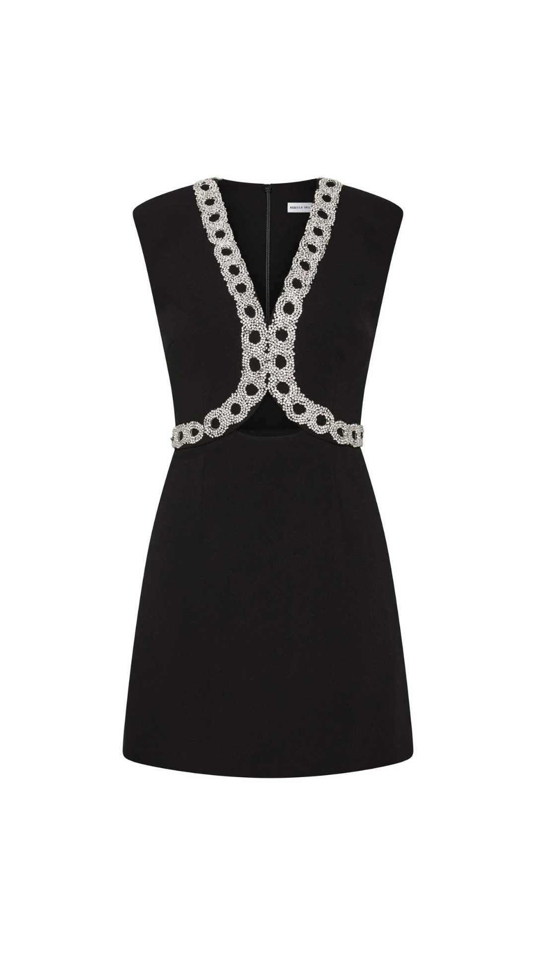 The Celinda Mini Dress radiates glamour and chic style, adorned with diamante trim embellishments. Tailored from bonded crepe, the V neckline effortlessly blends with the sleeveless fitted bodice, detailed with a front cut out for a touch of allure. Cinched at the waist, the A-line mini skirt shapes a sophisticated silhouette, secured with an invisible zip fastening at the back. Complete with lining for utmost comfort, this little black dress is a stunning choice for your next special event.