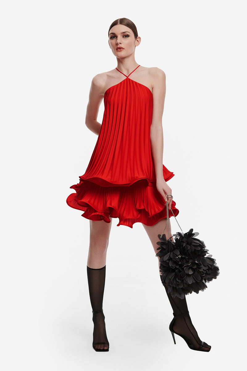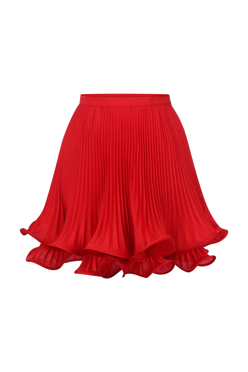 Colette Mini Skirt features pleated satin with regiline for structure and a flattering silhouette. Satin lining with regiline adds extra volume. The skirt has a flower-inspired design, with a zipper on the left.