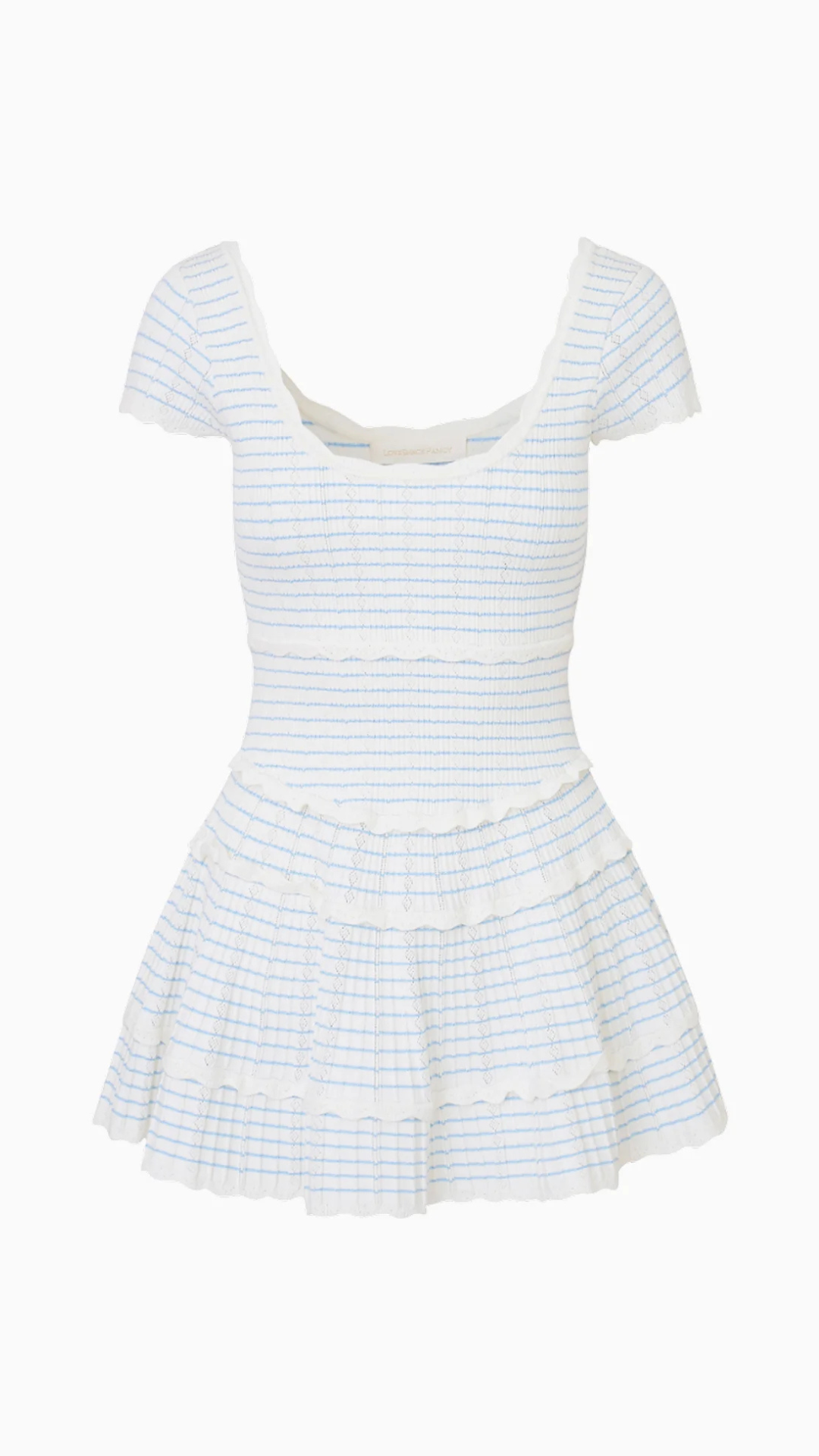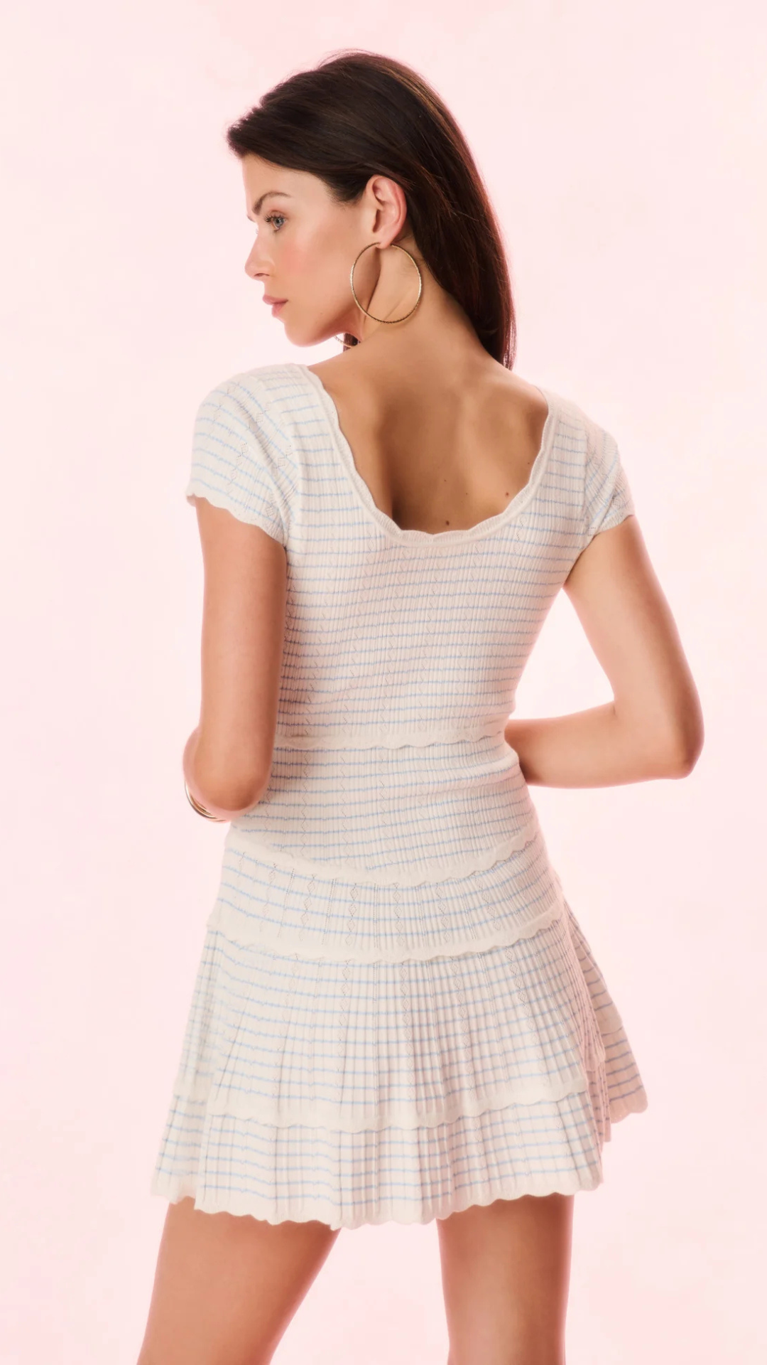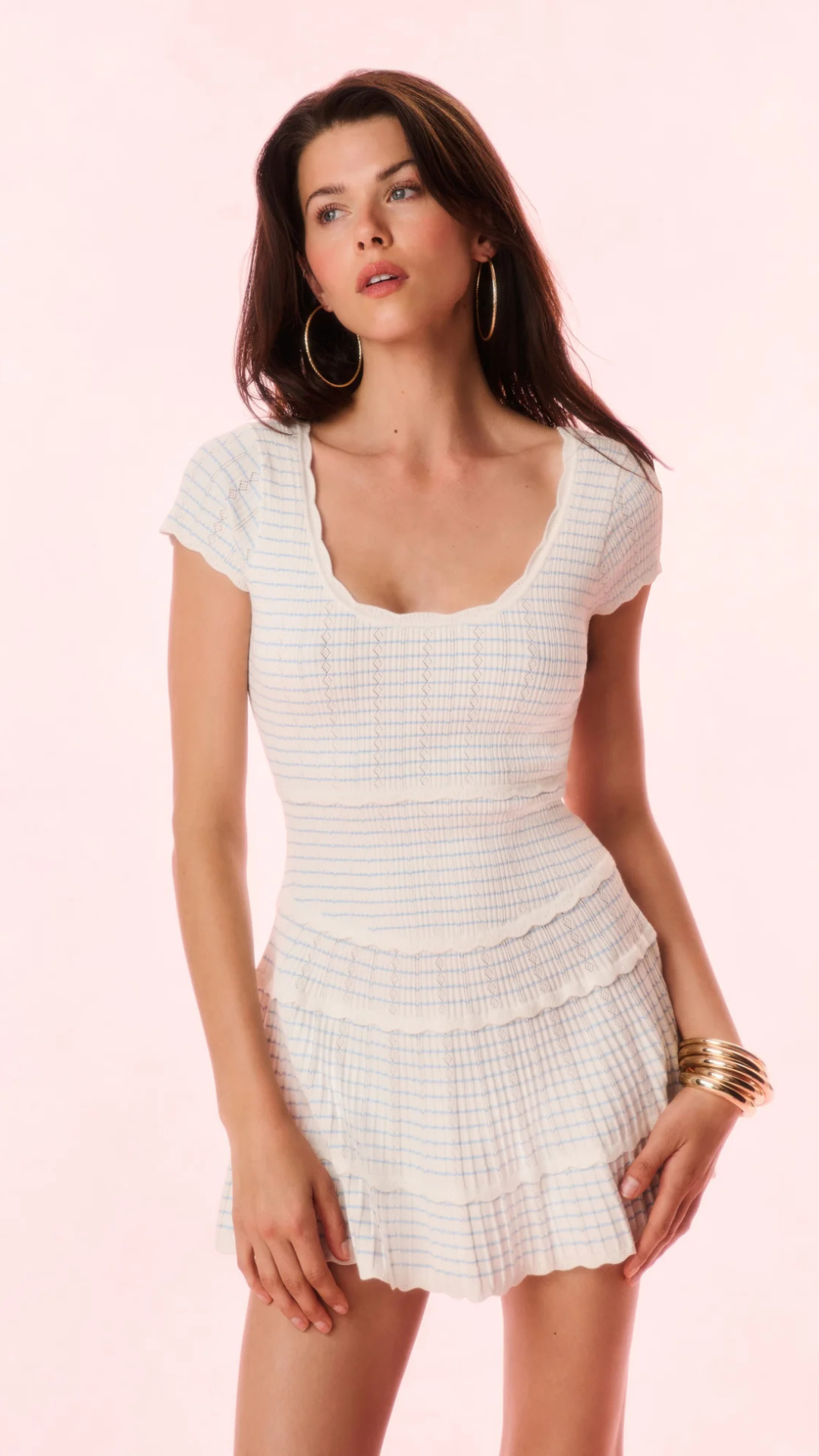 Sunshine ready in the Elisavette Dress. This charming mini debuts with our best-selling pointelle yarn with a nice stretch and extra soft feel. The dress has stripes throughout with lurex giving this piece our signature shimmer. Beginning with short cap sleeves, the piece has a scoop neckline, scallop details, and a fit-and-flare silhouette.Β