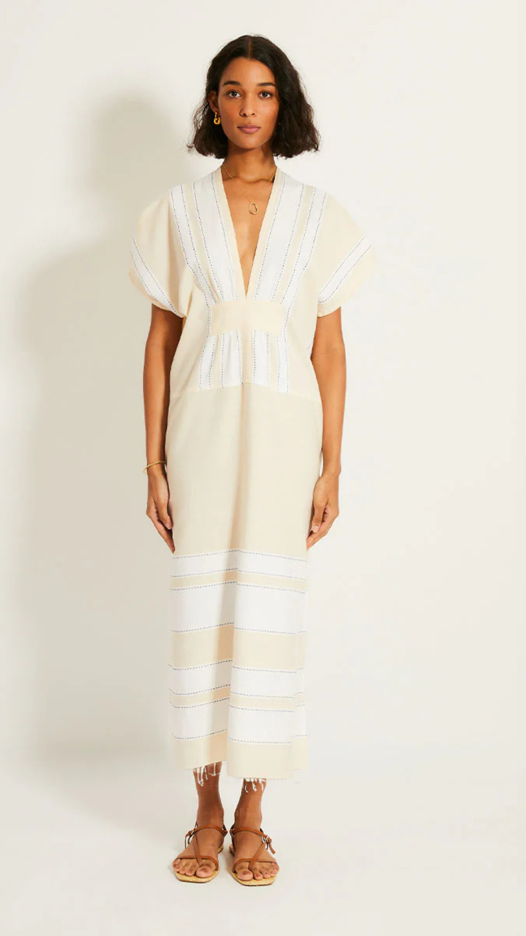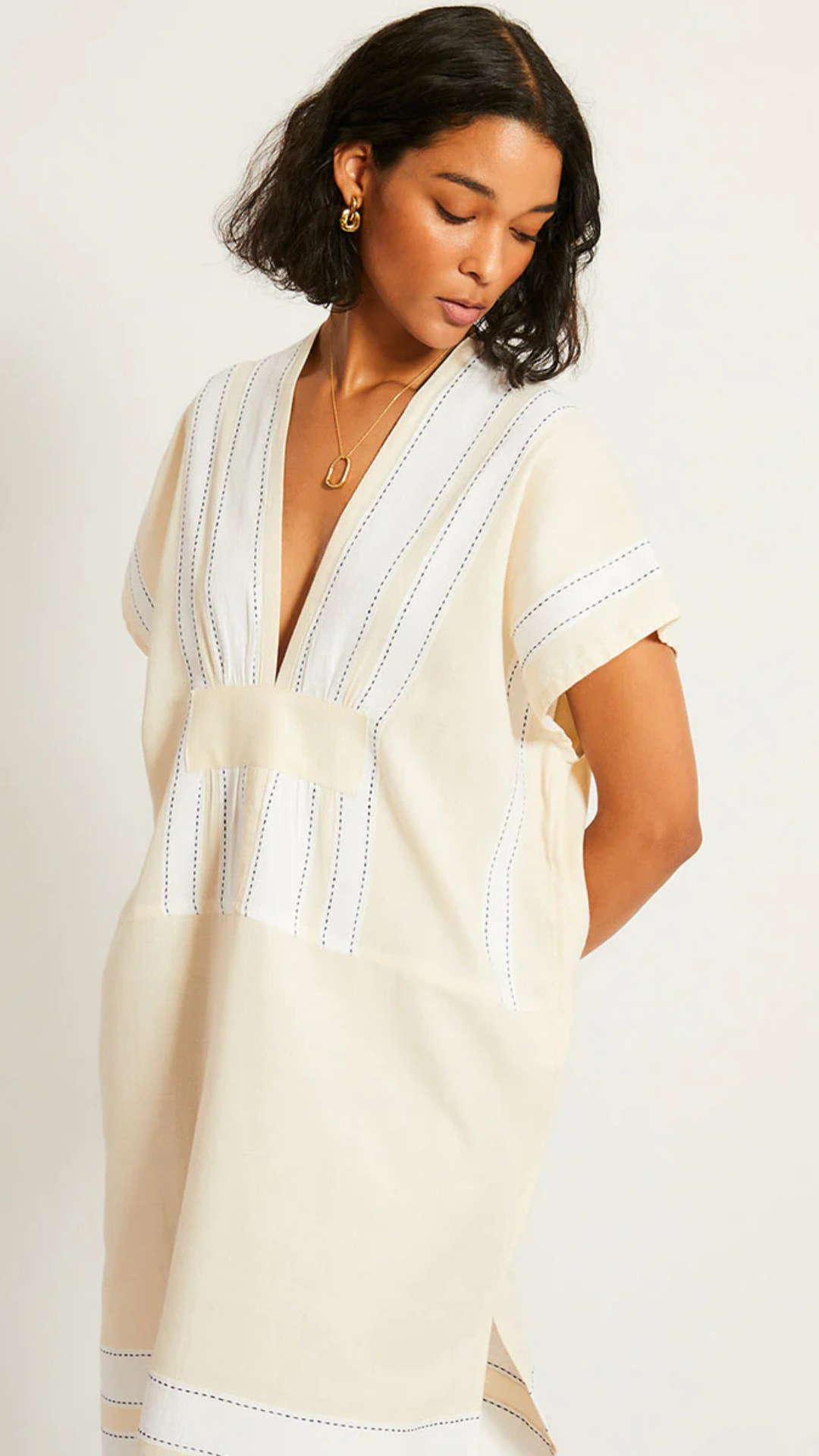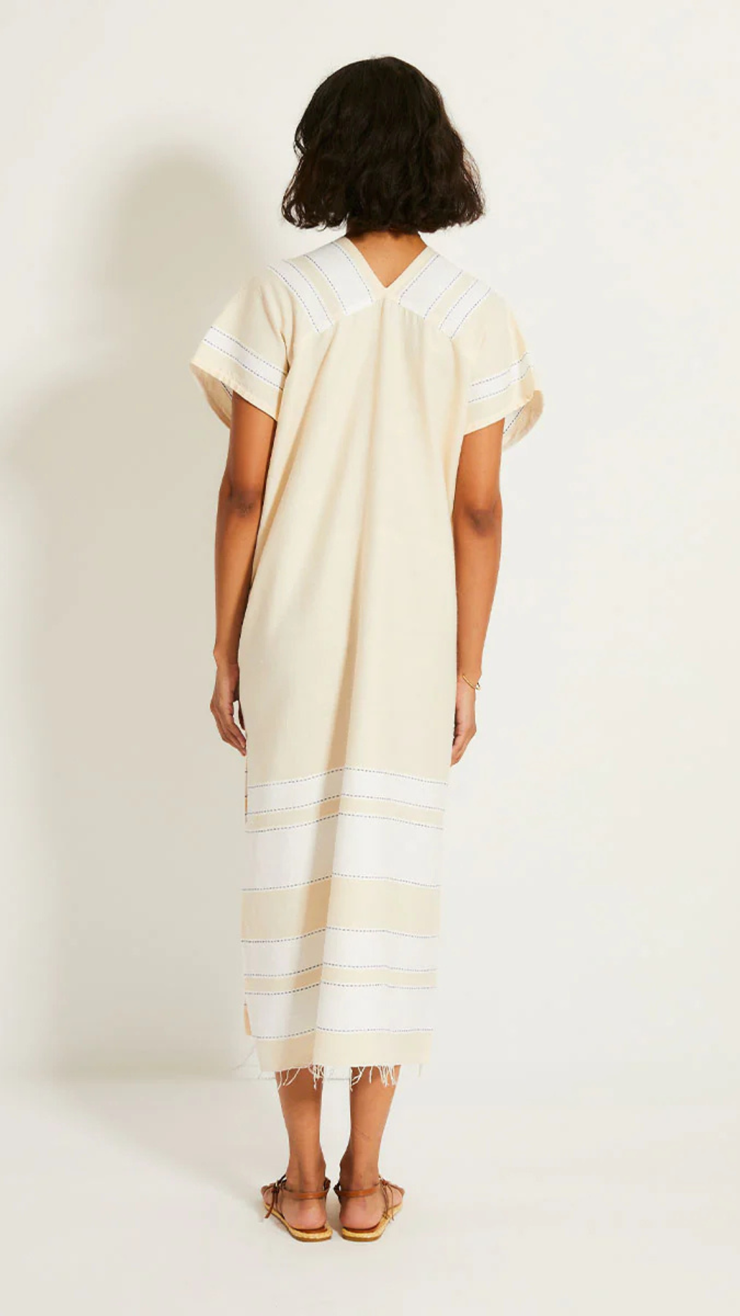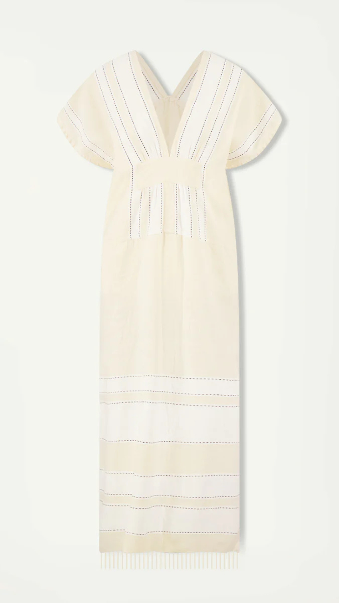 This long caftan dress features a V neckline, kimono cap sleeves and a gathered empire waist. The dressβs easy fit creates an hourglass silhouette highlighted by the gradual flowy hem.
