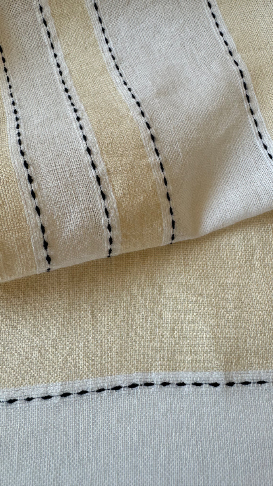 The Debre Cream Collection features bold stripes in bright white on a vanilla cream background, accented with navy pick stitch detailing. Inspired by African textiles, these engineered stripes create the impression of applique while being seamlessly woven into a single, sophisticated design.