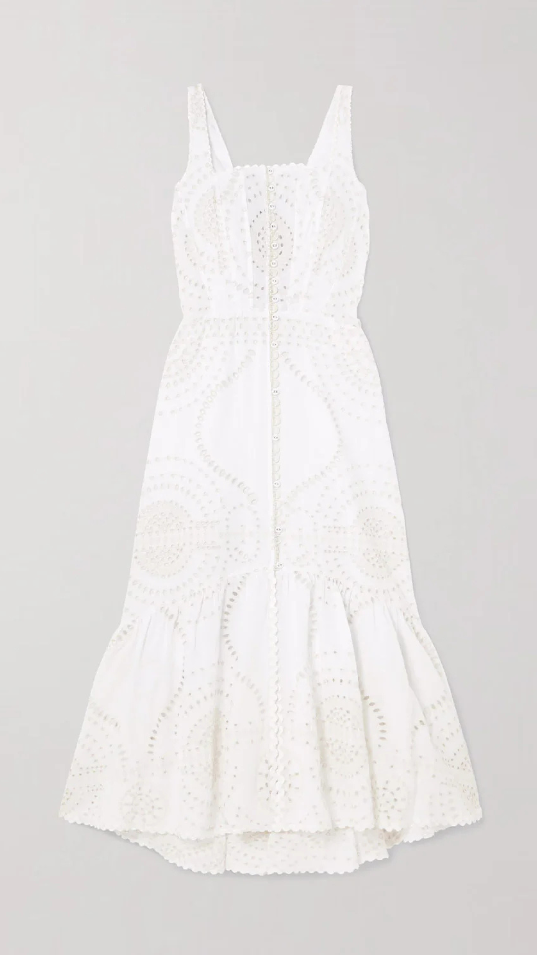 The GREBA maxi dress, in embroidered cotton-linen blend, is your dress of the season. Its square neckline with wide straps provides structure and its ruffled buttoned skirt gives a sinuous movement to your walk.