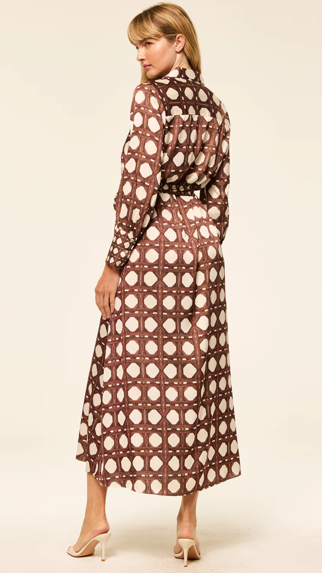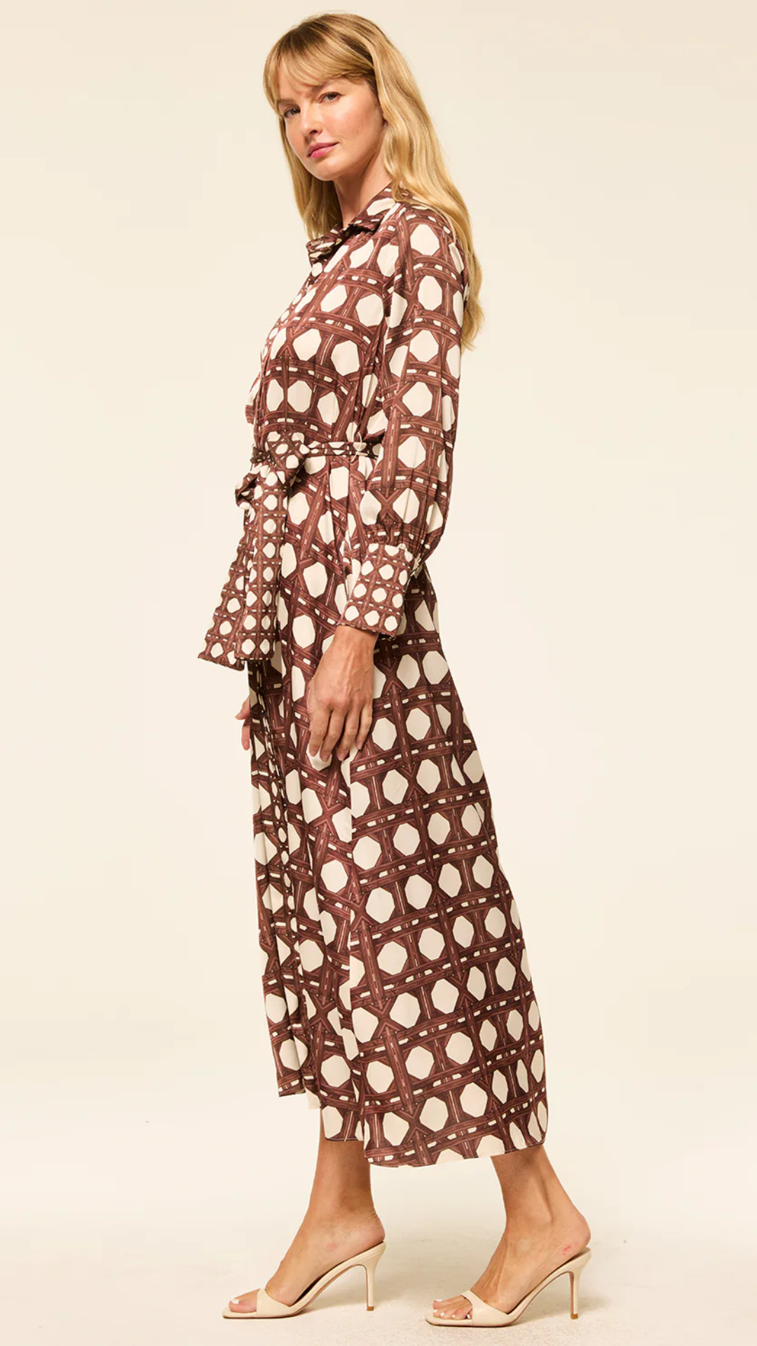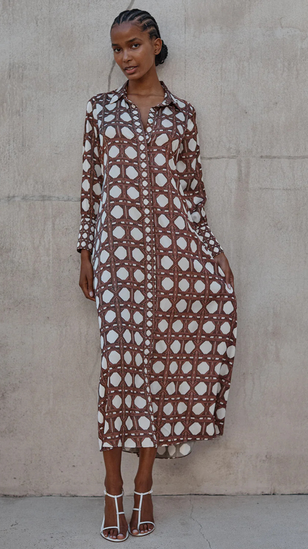 Herminia is a chic shirtdress crafted from luxurious Chocolate Rattan printed satin. This ankle-grazing silhouette features a covered button placket with a contrast scale rattan print that extends to the hem. It has a fold collar, long sleeves with wide button cuffs in the same contrast scale print, and slit pockets. An optional self-tie belt offers styling flexibility. A timeless piece you'll turn to for seasons to come.