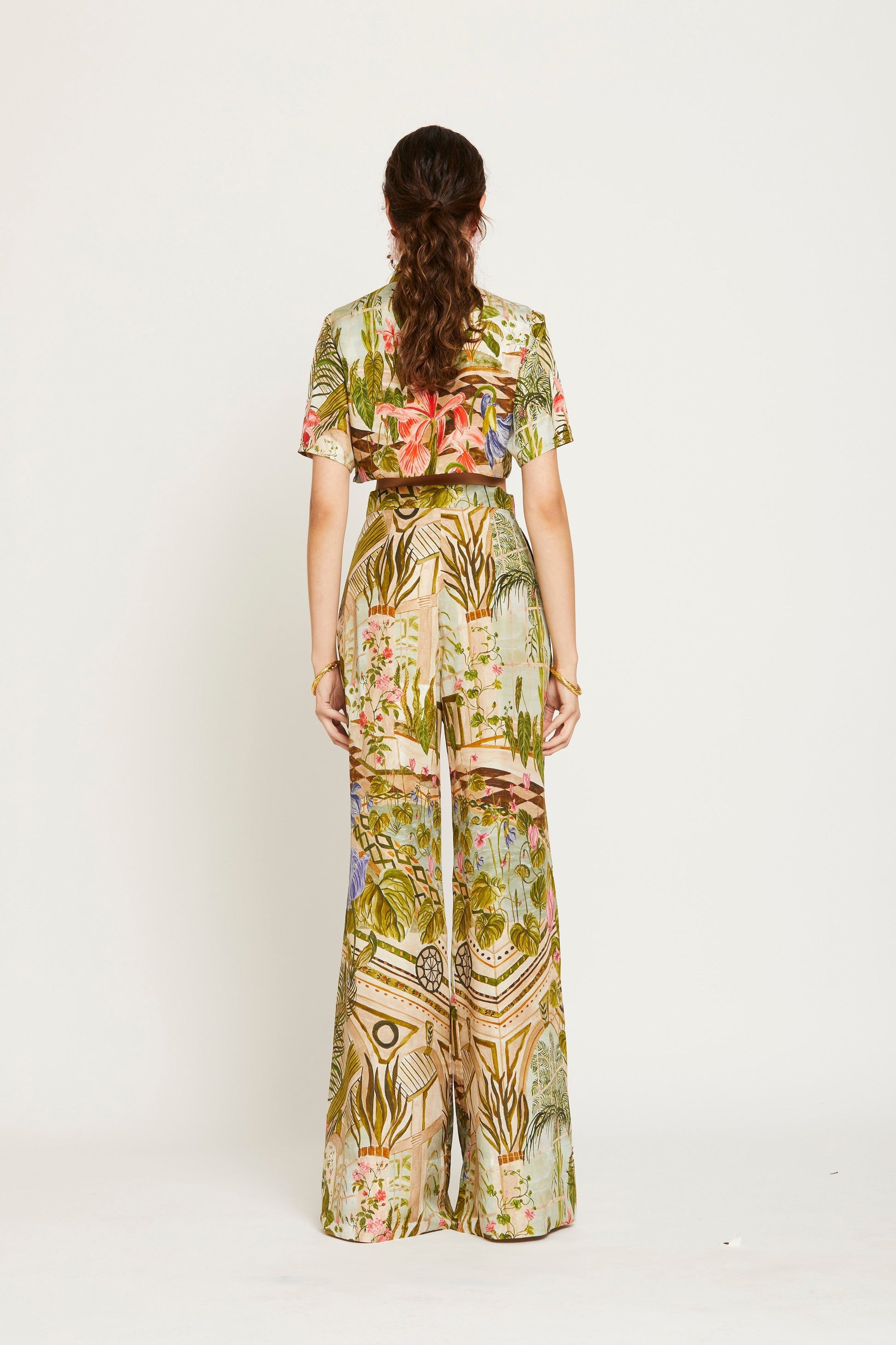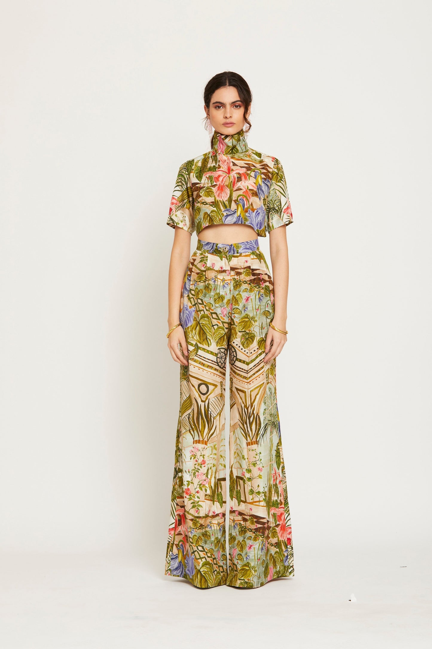 High-rise waist, wide-leg style. Pleats along front, slant pockets.