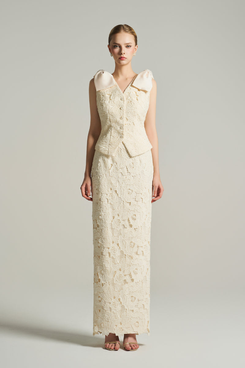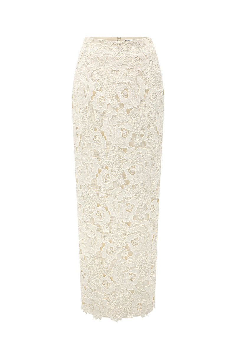 A refined long skirt crafted from intricate lace with floral motifs and subtle crystal accents that catch the light. Its sleek pencil silhouette exudes elegance, perfect for formal occasions. The delicate lace and soft shimmer of the crystals create a timeless yet modern look