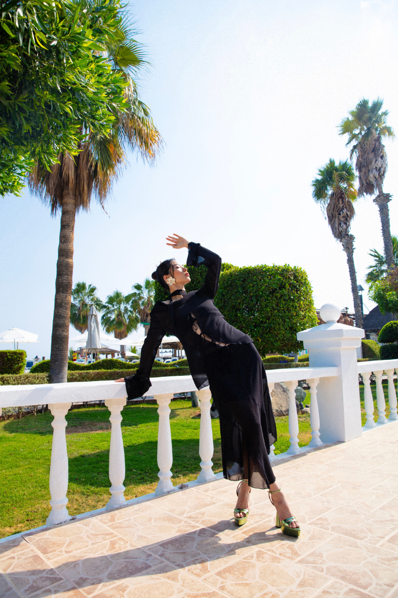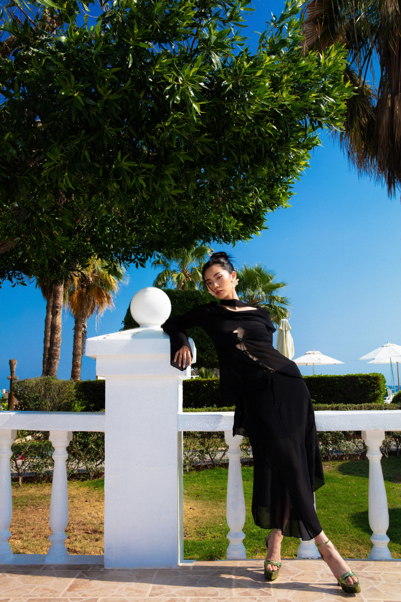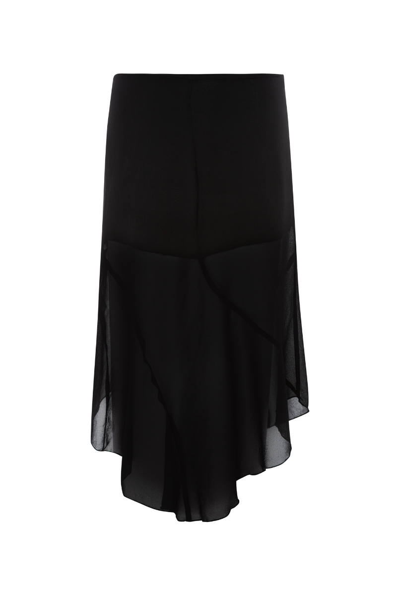 The Laura Skirt is a low-waist midi skirt made from sheer fabric, featuring an asymmetrical shape. For a coordinated look, pair it with the Laura Top.