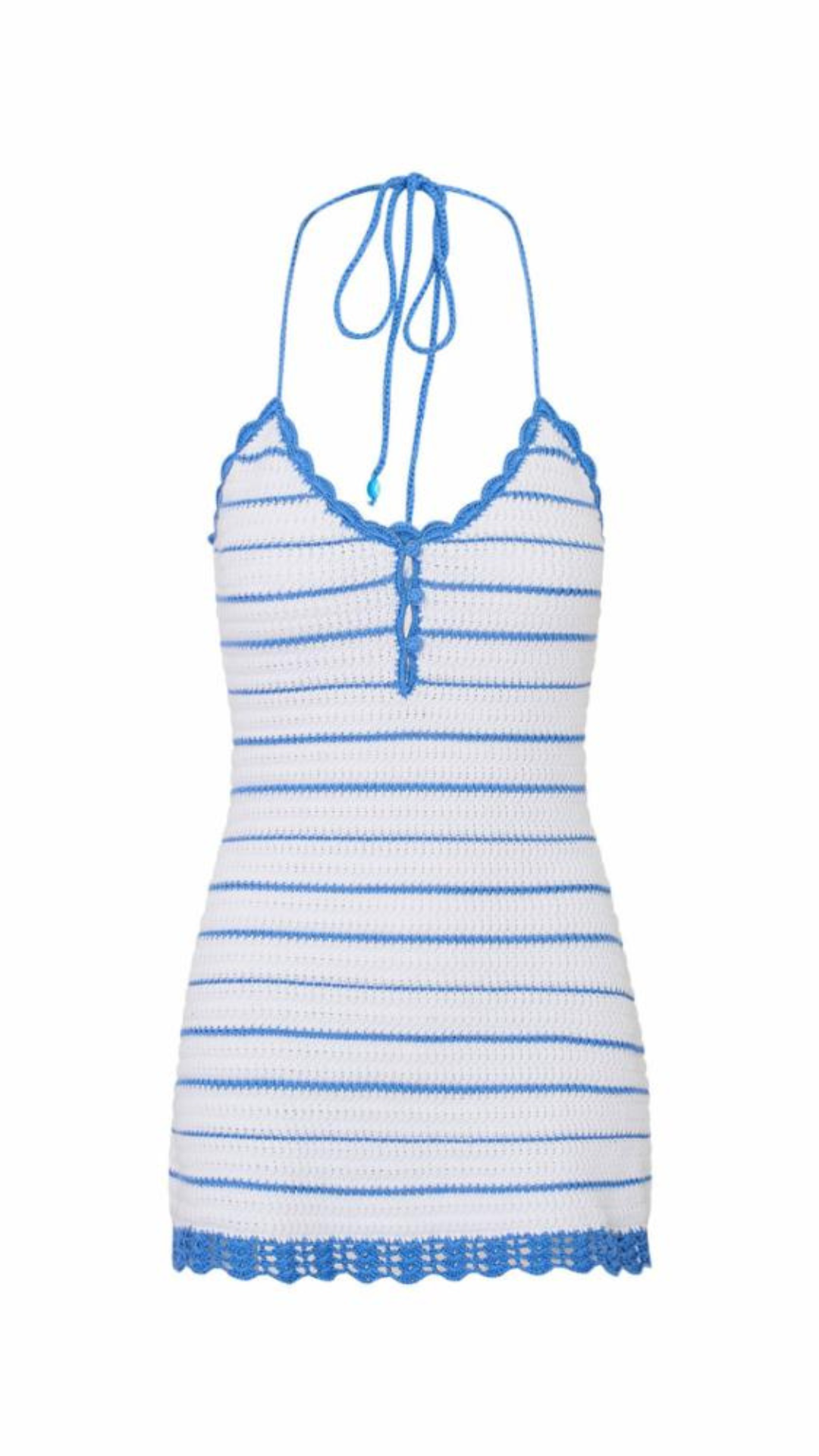 Nautical and coastal chic in the Lilibelle Dress. This warm weather mini arrives with a knit striped crochet fabric featuring crochet scallop trims throughout. The mini features a halter neckline with scallop details, a plackett down the front with crochet buttons, and loop straps made from a crochet chain halter. This piece is finished with a scallop detail at the hem. Pair with the Lamiya Cardigan for a matching layer.Β