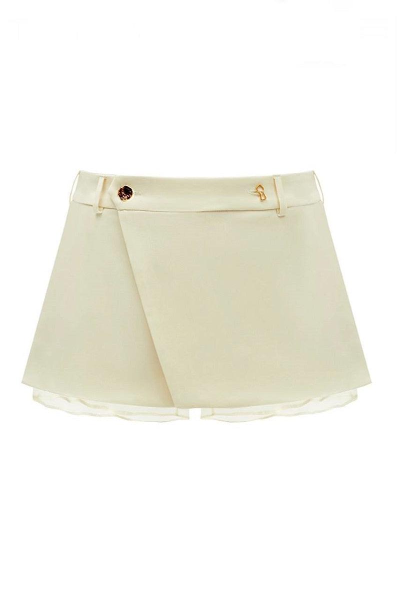 Mid-length shorts made of high-quality premium wool have a flared cut and a low rise on the hips. Designer drawstrings emphasize the waist, visually narrowing it. Decorated with branded gold buttons, which are a recognizable feature of the brand. These shorts go perfectly with a vest from the "Existence" collection.