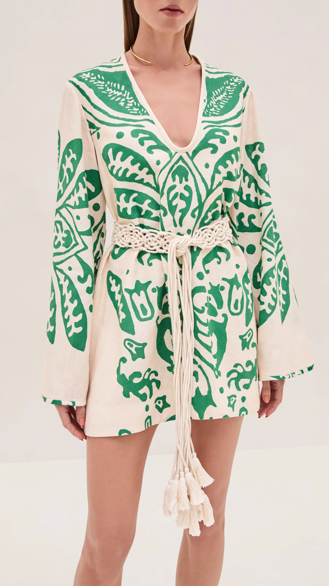 The Noriko Dress is a cotton-linen blend tunic dress featuring a removable macrame belt.