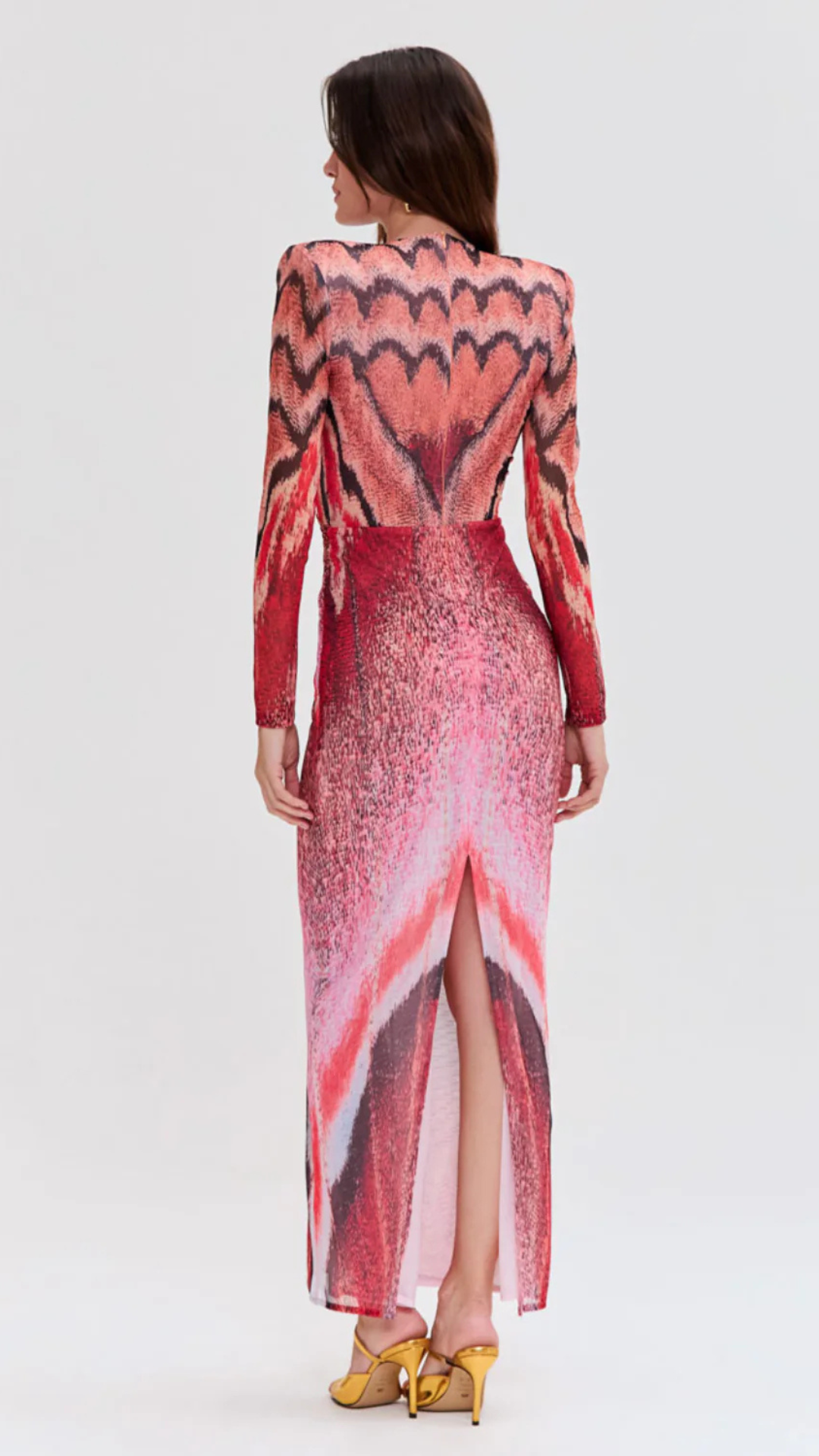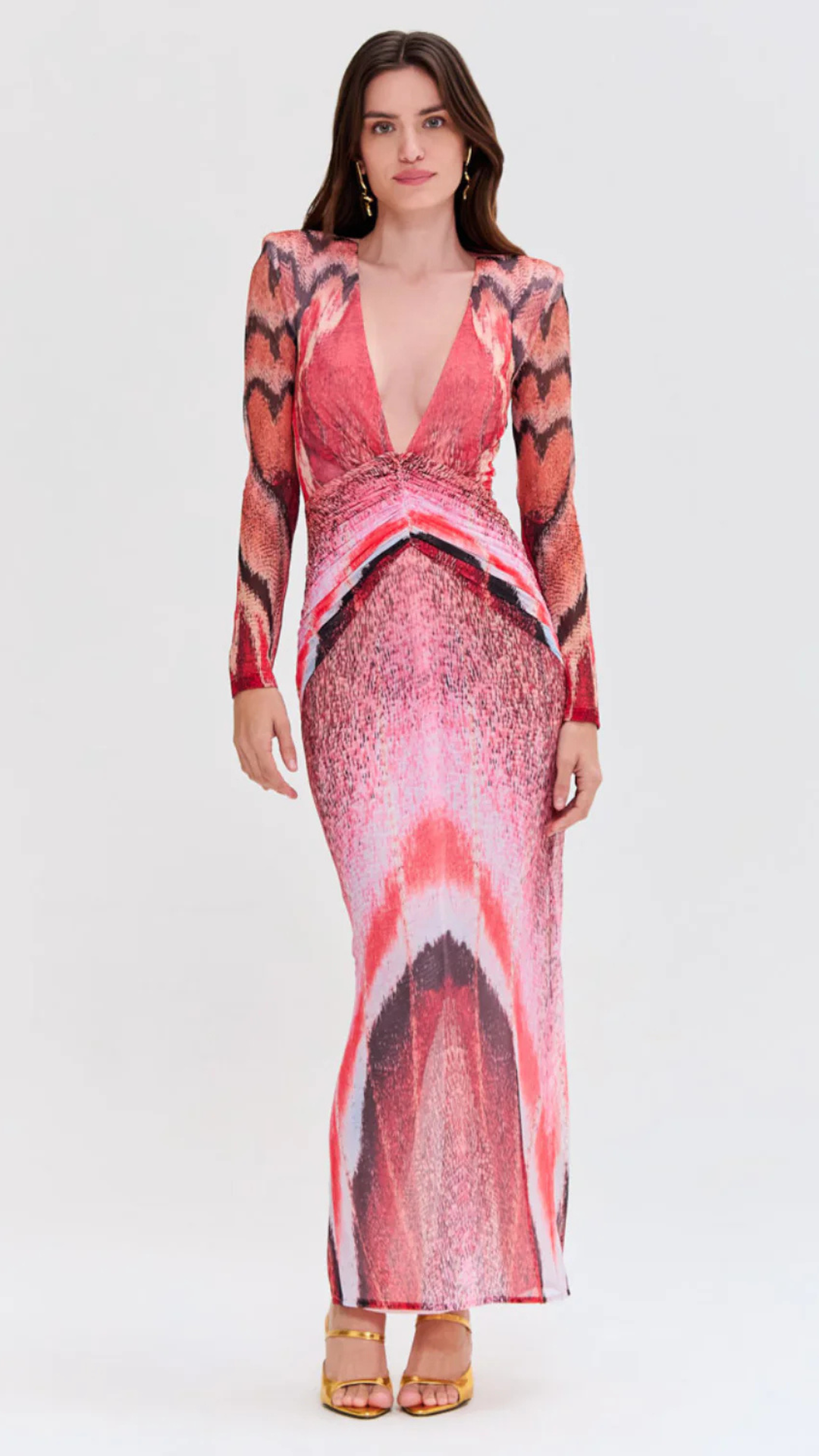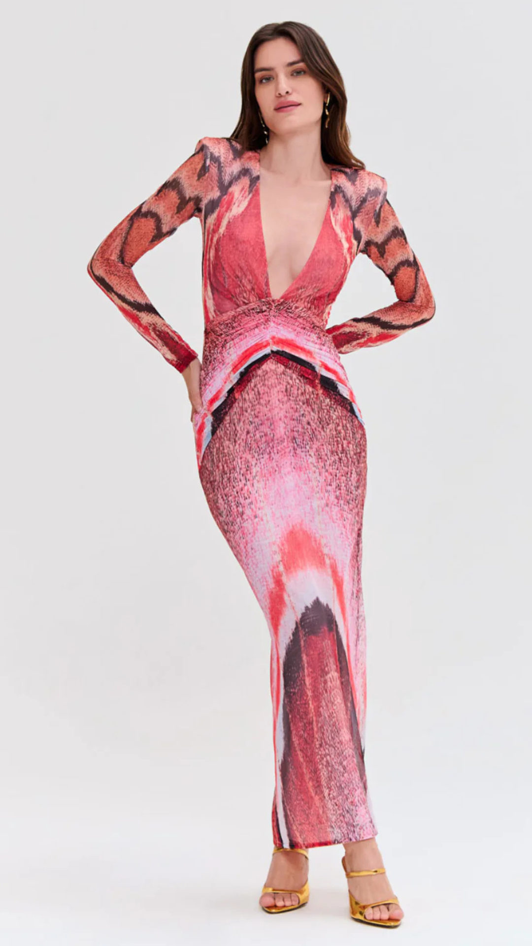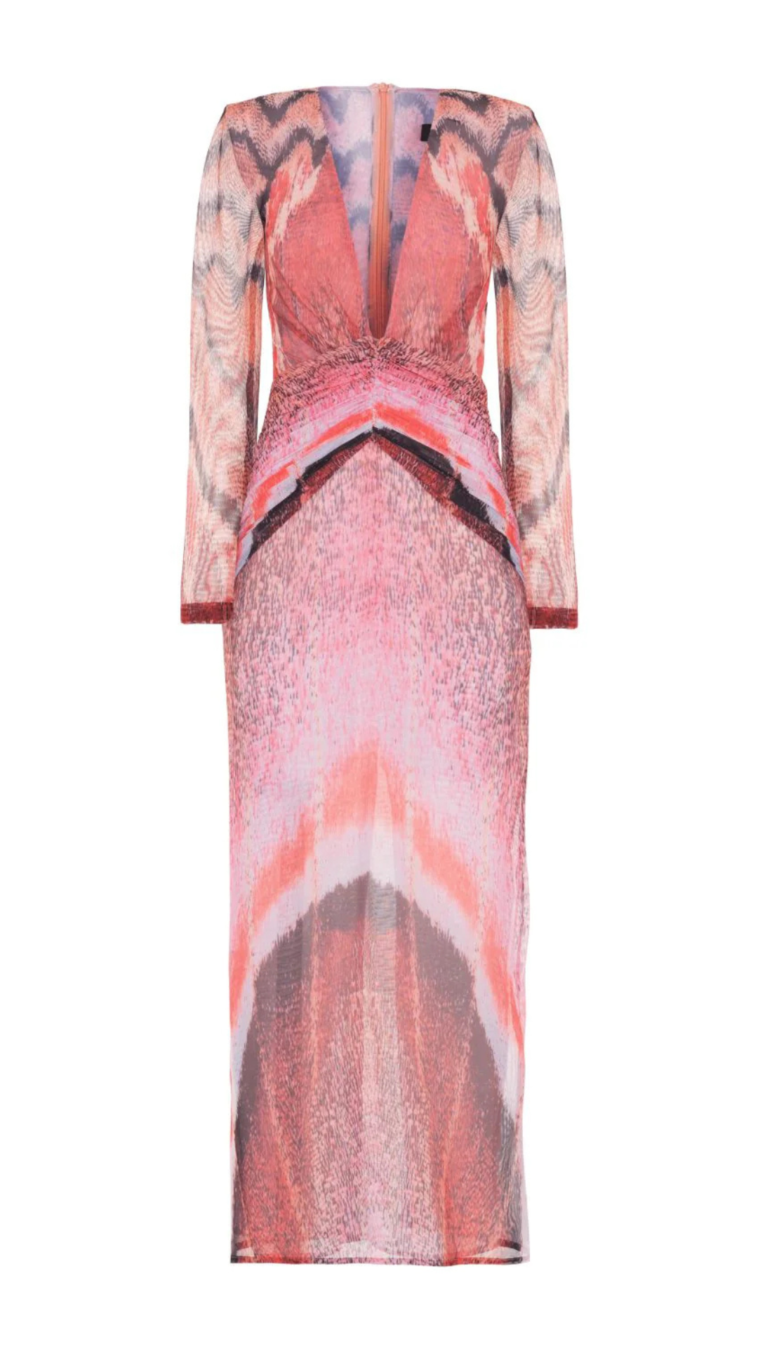 This mid length dress features a plunging V neckline with structure shoulders and sheer long sleeves into a fitted bodice and mid length skirt. Fully lined with a concealed back zipper closure.