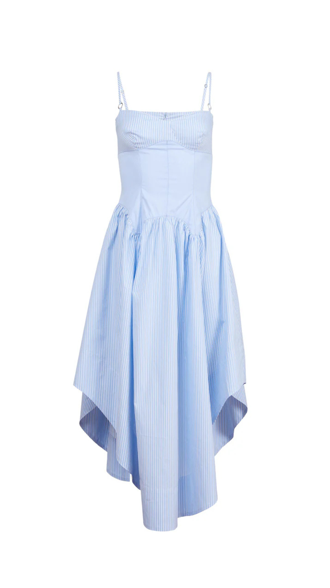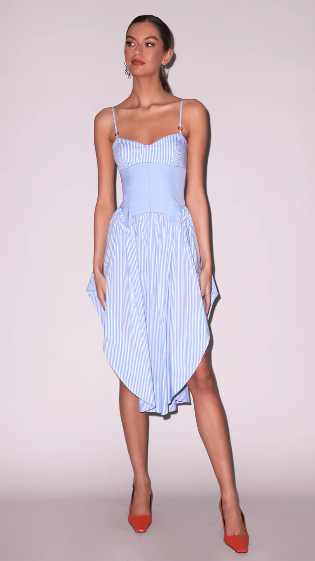 Our lightweight cotton Poplin Cupped Midi Dress, featuring corset inspired underbust & garter seaming details with adjustable straps and invisible zip closure. Flirty full volume skirt with higher cut hemline at sides.