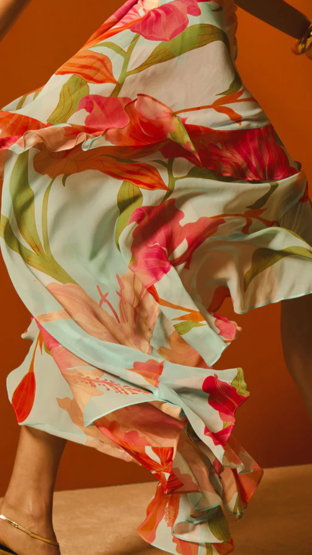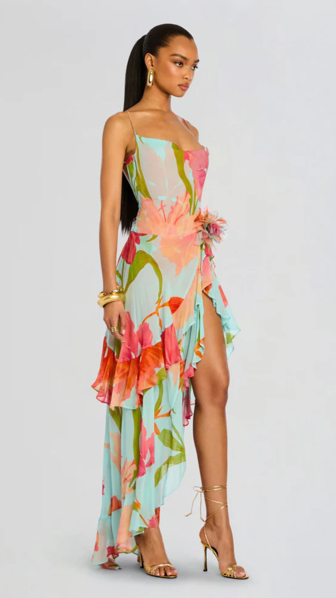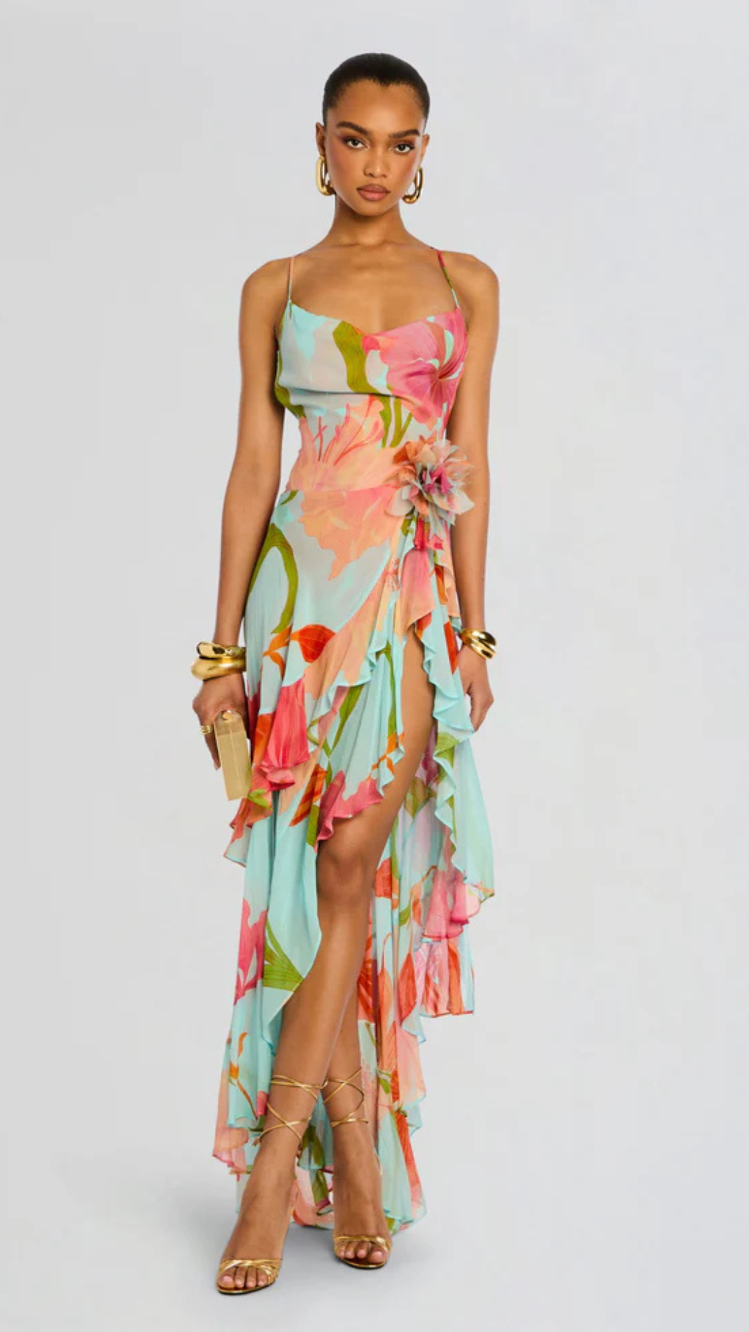 Channel your inner romance with our Samara Dress, featuring a whimsical ruffle hem, flowing silhouette, daring high slit, and captivating open back. Embrace the epitome of femininity and grace with this statement piece that promises to steal the spotlight at any occasion. Shown here in Aqua Primavera.