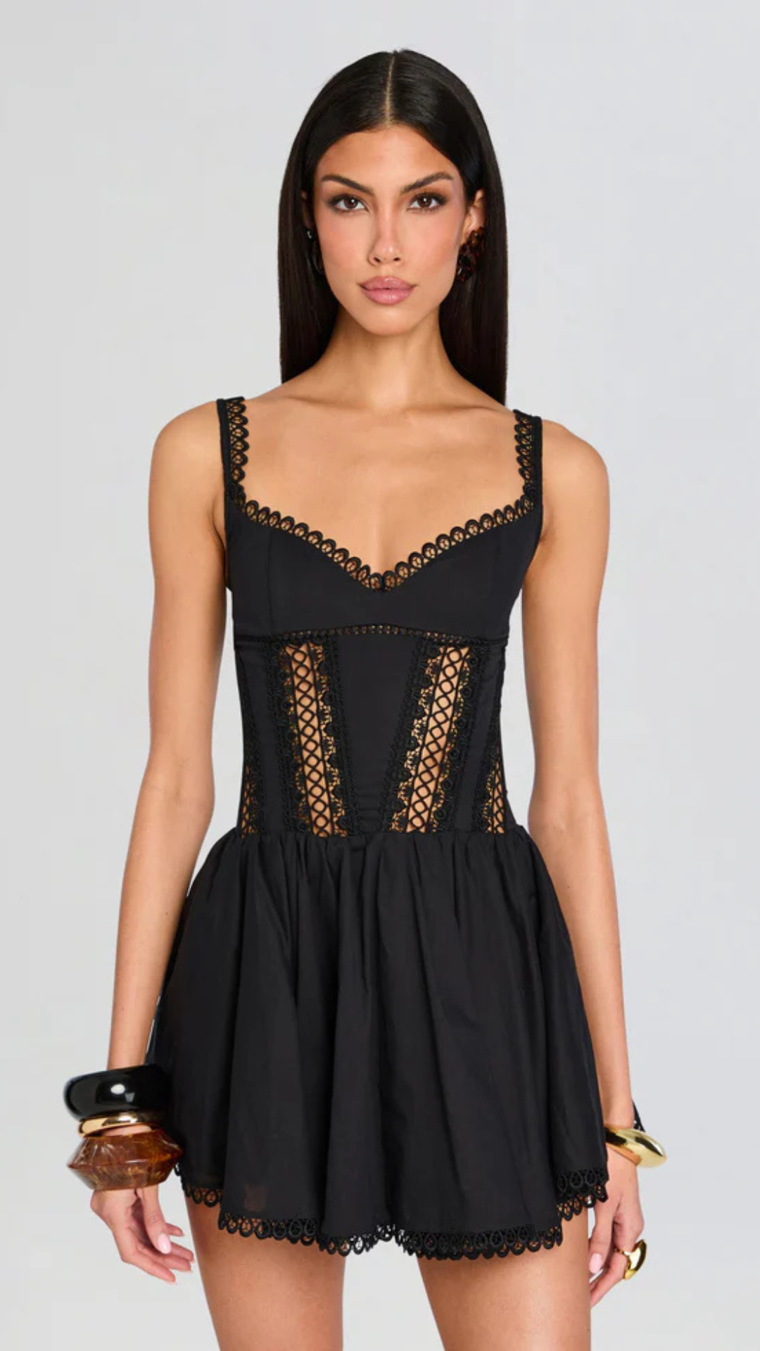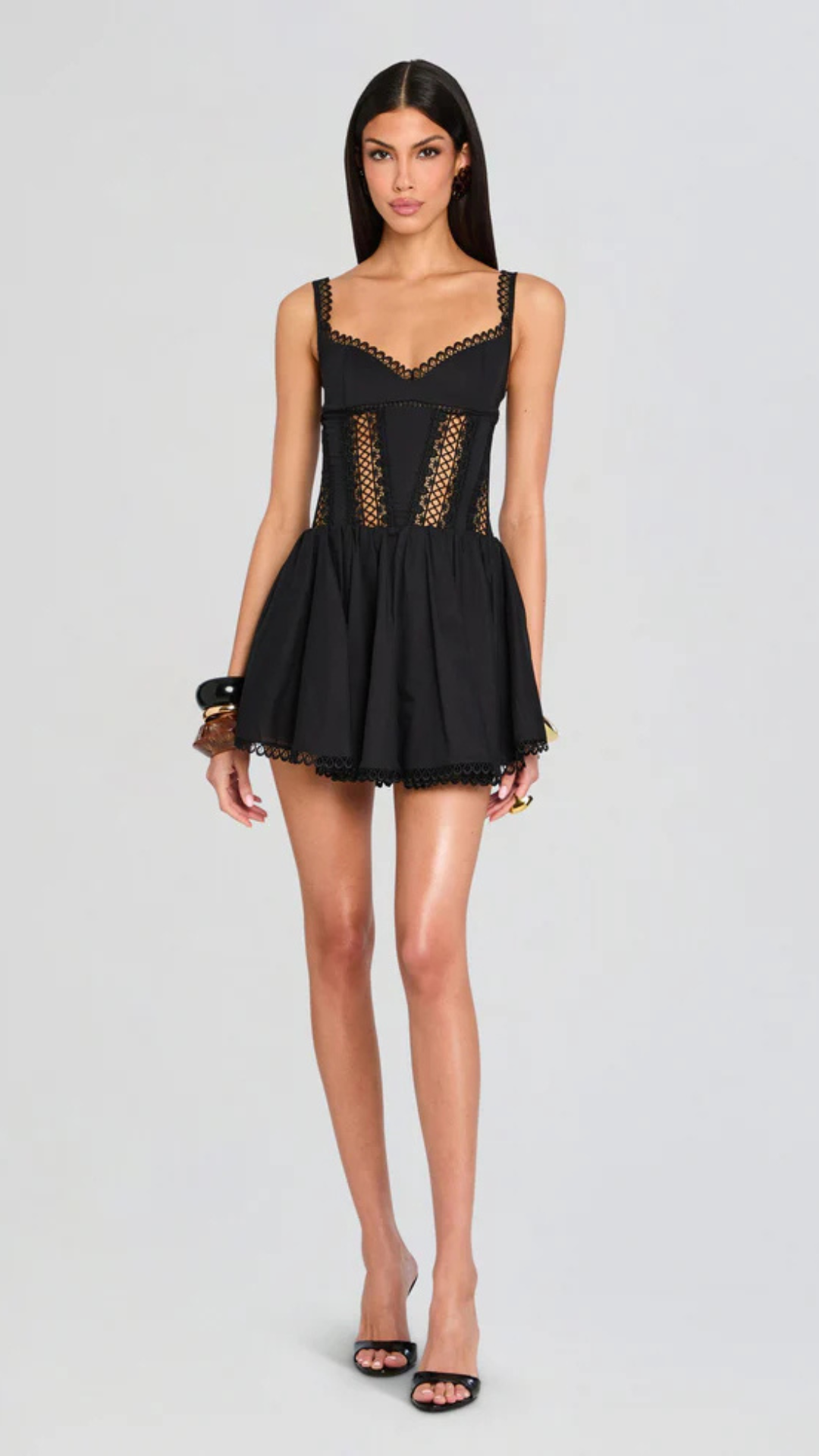 The GARDENIA mini dress is a feminine and flattering piece that will accompany you on hot summer days. Its balconette bust gathered with straps, stylizes and gives continuity to a body adorned with precious guipures that create an optical illusion of corsetry. The layered skirt finishes creating a dreamy skater silhouette.