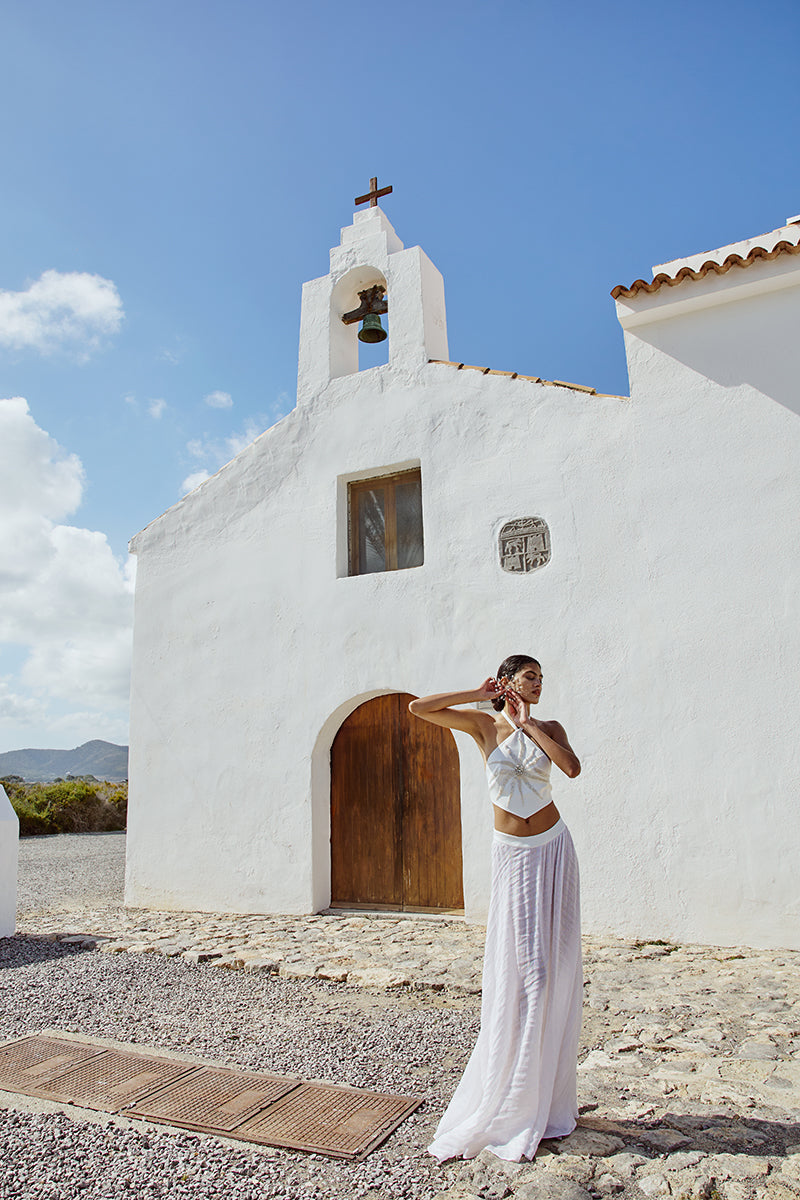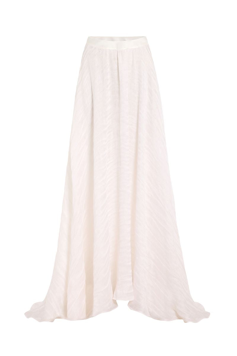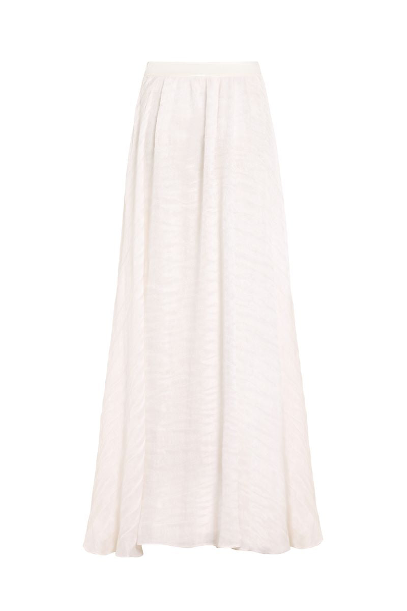 A flowy maxi skirt in eggshell with a soft silk waistband and hidden back zipper for a refined silhouette.